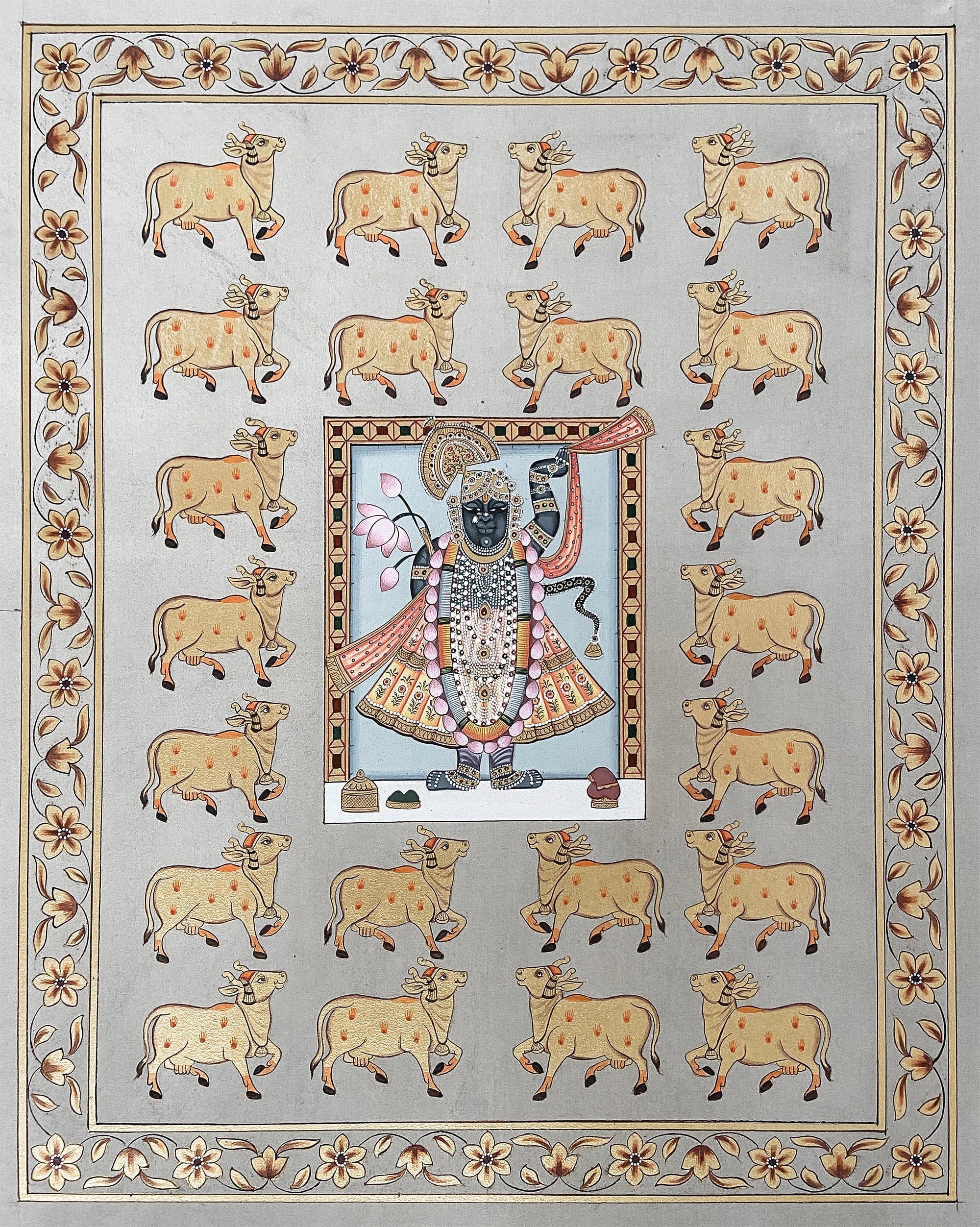 In many temples, Pichwai paintings are offered to God with flowers, garments, food, and jewelry. In most of the temples taking pictures of God is not allowed. So, instead of pictures of God people purchase Pichwai paintings from the temples.