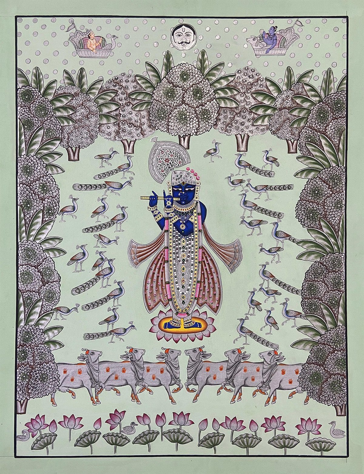 Every Pichwai painting symbolizes different seasons, leelas, and more things which make it more unique and attractive when you notice it. Lotuses & peacocks symbolize different weathers such as summers and monsoon respectively.