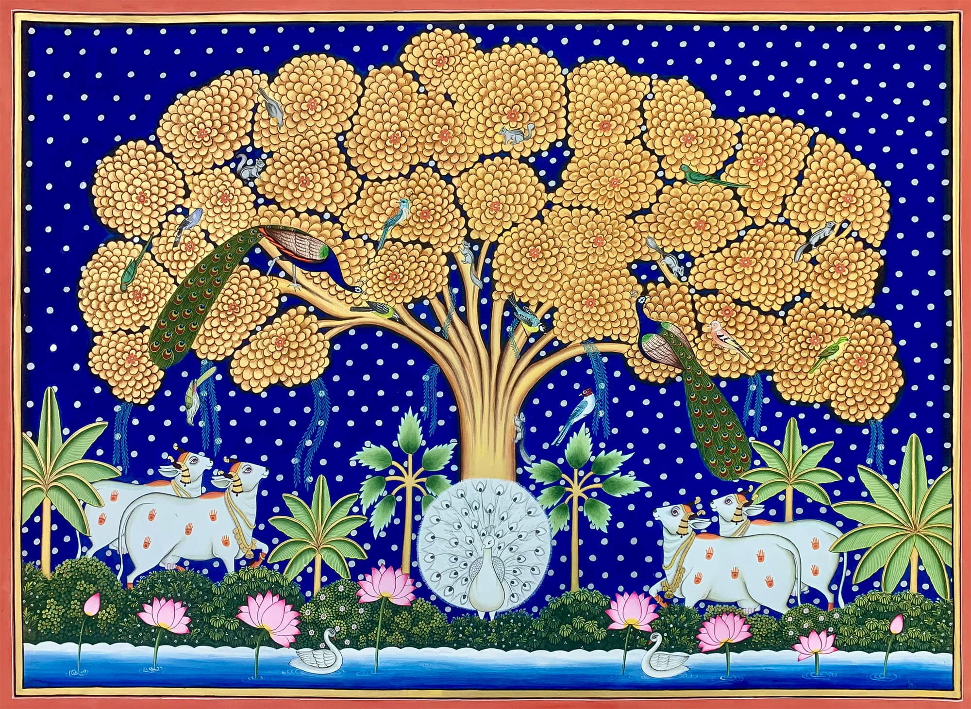 Nowadays, Pichwai paintings are not just available in religious painting but also in many different patterns as well, such as landscapes, flowers, animals, and more. You can also use it for the decoration of your living rooms.
