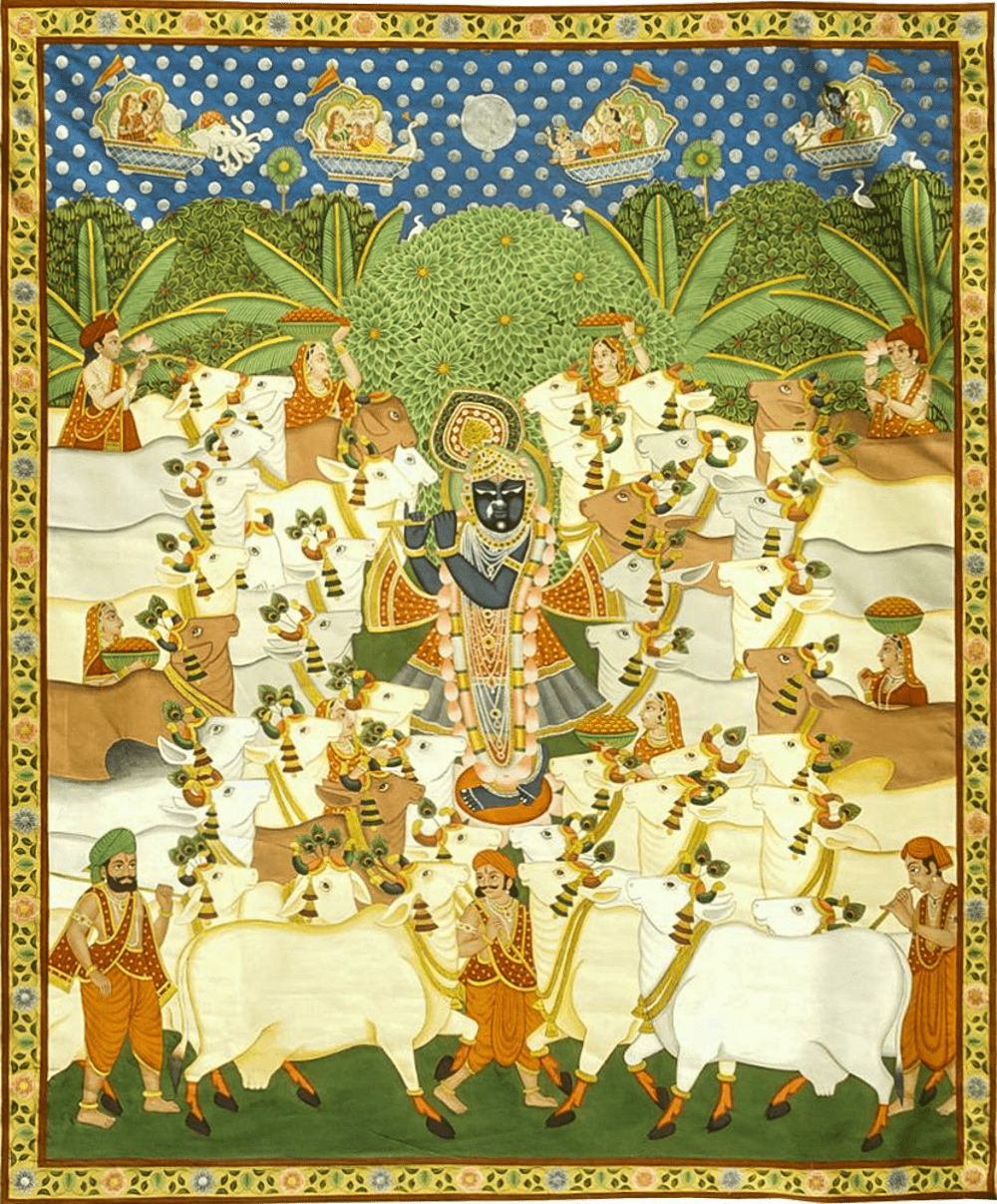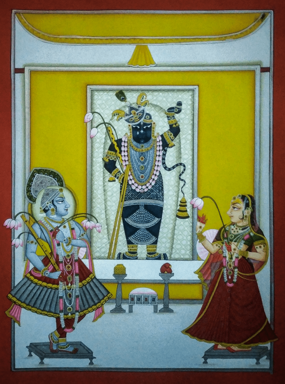 In many temples, Pichwai paintings are offered to God with flowers, garments, food, and jewelry. In most of the temples taking pictures of God is not allowed. So, instead of pictures of God people purchase Pichwai paintings from the temples.