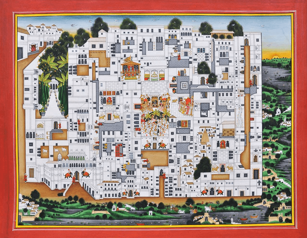 Pichwai paintings are made as a referral of the latest kirtans and views of the temples on a piece of red cloth by threads of different colors.