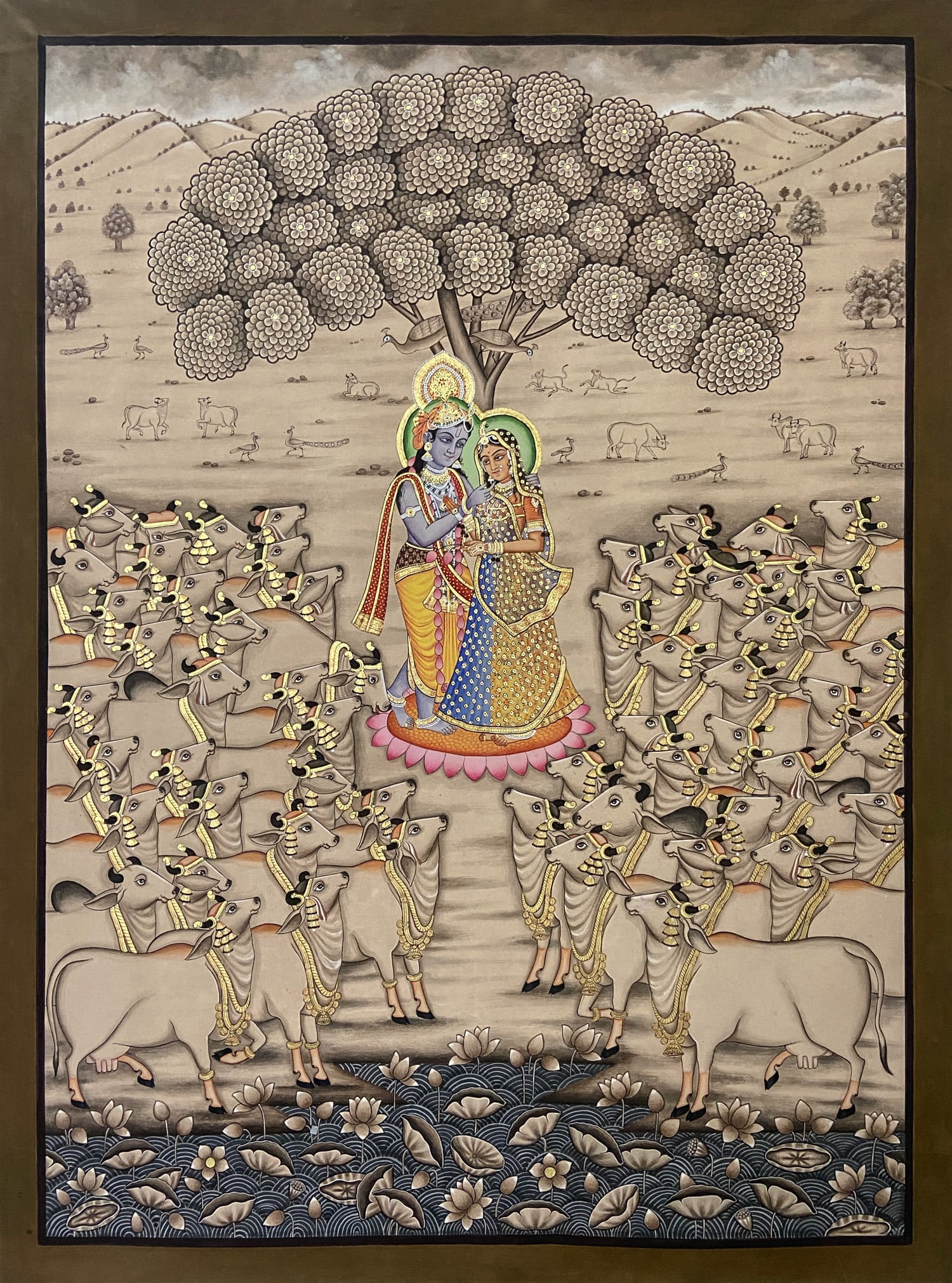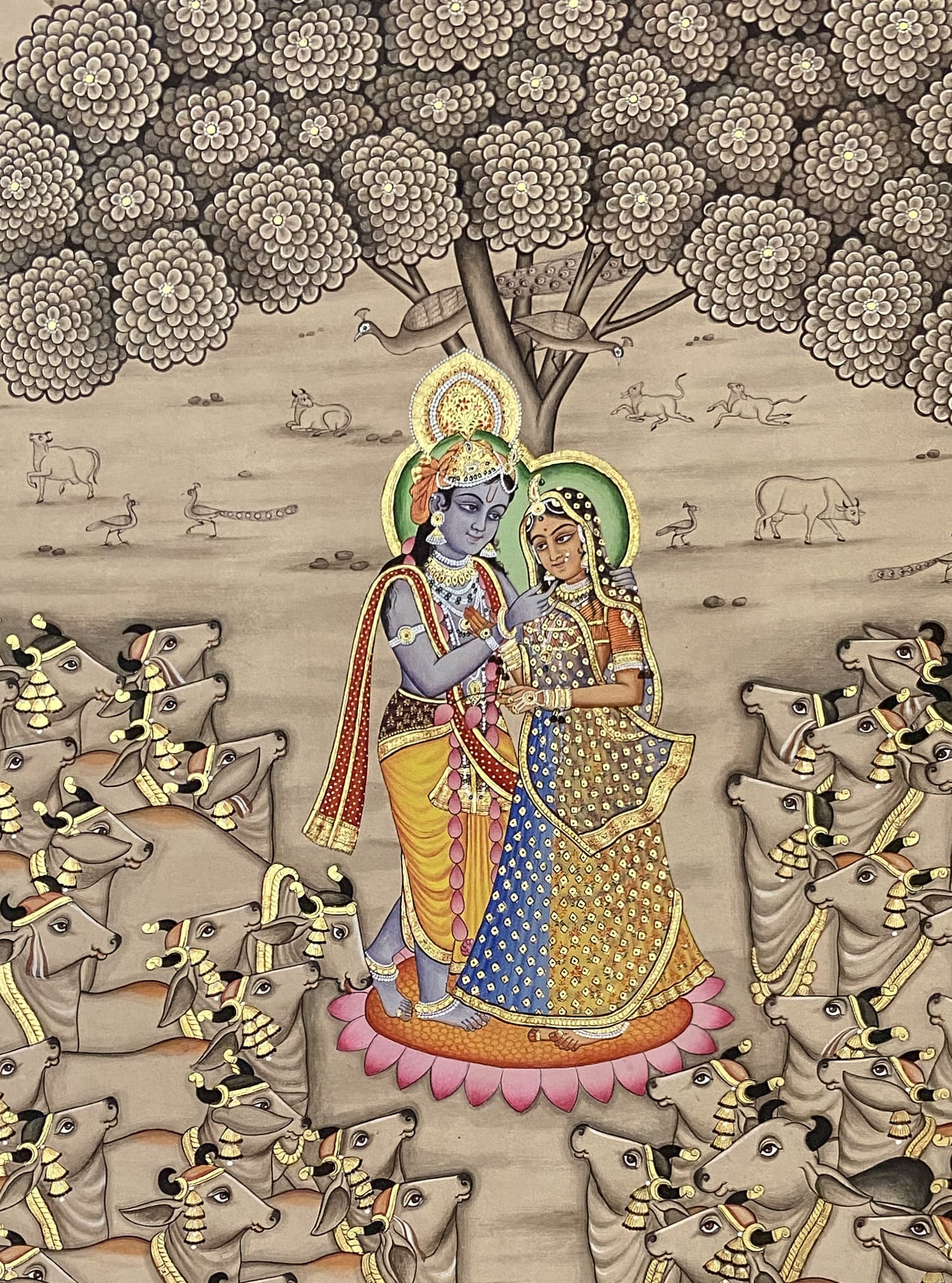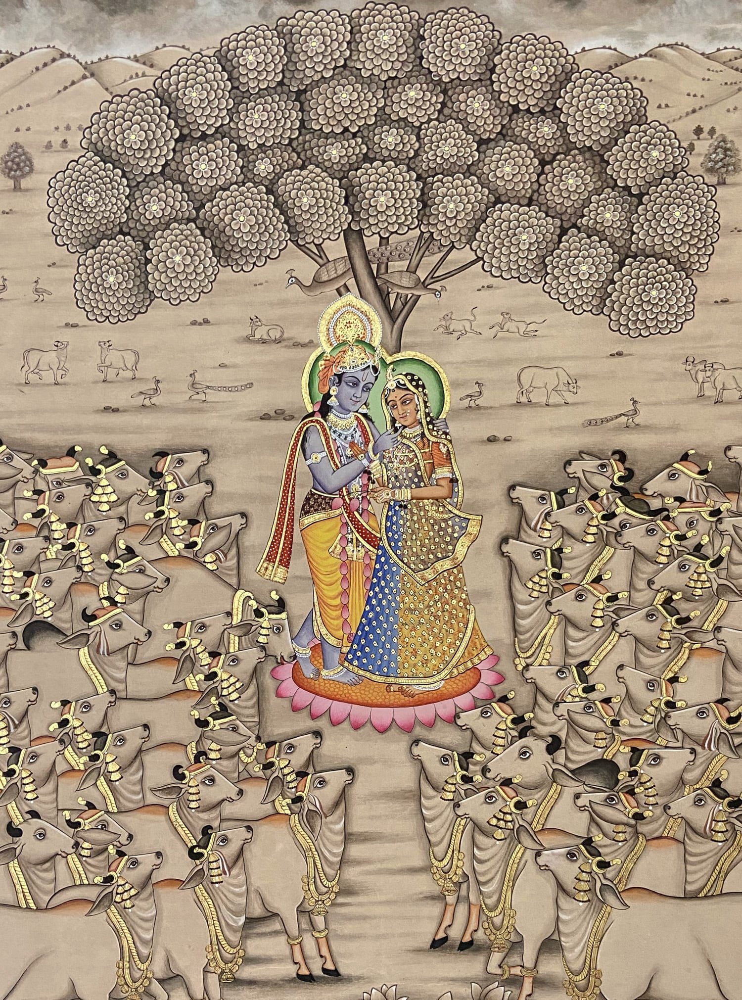 With this alluring Krishna Pichwai painting, let your walls shines mysteriously beautiful. You get a matte finish with highly good quality and sharp reflection. Just hang it on your living room and give yourself a different feel.